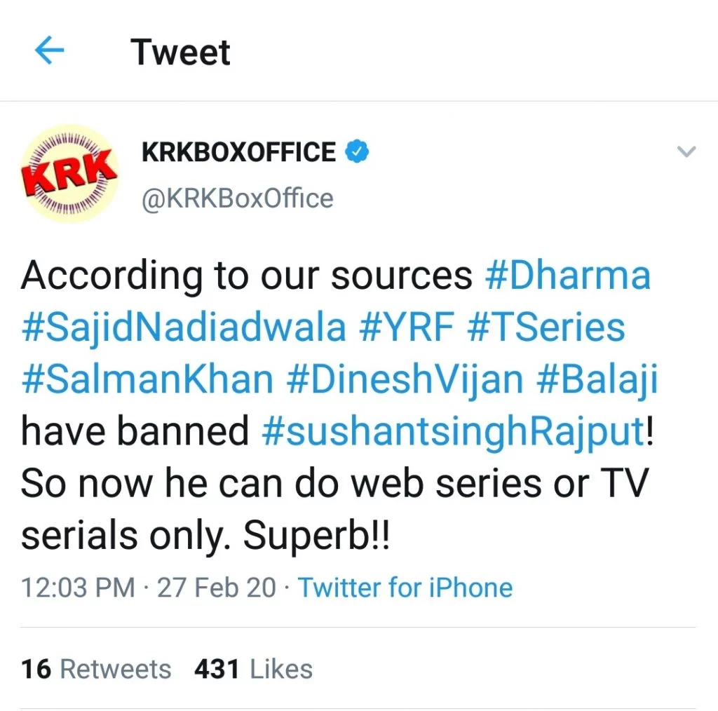 In the tweet, we can see that the actor Sushant Singh Rajput was banned by the big producers including Karan Johar, Salman Khan, YRF, T-Series, and many more. Well, the actor was struggling alone and we have reported that he had a fight with a producer and the reason behind it is unknown. Sushant Singh Rajput was great Bollywood actors and he would be missed by his fans totally.